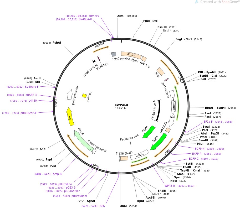 质粒名称:pWPXLd 质粒编号:12258 质粒备注: (Empty Backbone) 载体名称:pWPXLd 载体大小:10455 载体类型:哺乳动物表达,慢病毒 原核抗性:氨苄青霉素,100μg/mL 培养温度:37℃ 克隆菌株:Stbl3 高拷贝/低拷贝:高拷贝 插入基因:None 克隆方法:限制性内切酶 5'克隆位点:MCS - see map (not destroyed) 3'克隆位点:MCS - see map (not destroyed) 5'测序引物:See map 质粒图谱: