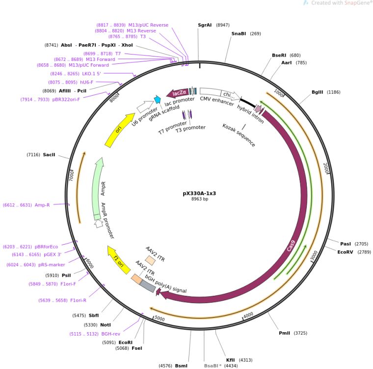 质粒名称:pX330A-1x3 质粒编号:58767 质粒备注: Expresses Cas9 nuclease and gRNA 载体名称:pUC ori vector 载体类型:哺乳动物表达,CRISPR 原核抗性:氨苄青霉素,100μg/mL 培养温度:37℃ 克隆菌株:Stbl3 高拷贝/低拷贝:高拷贝 插入基因:humanized S. pyogenes Cas9 nuclease 基因别名:SpCas9 基因别名:hSpCas9 物种来源:S. pyogenes 插入大小:4272 启动子:CBh 克隆方法:未知 5'测序引物:T7 (TAATACGACTCACTATAGGG) 3'测序引物:T3 (GCAATTAACCCTCACTAAAGG) 质粒图谱:
