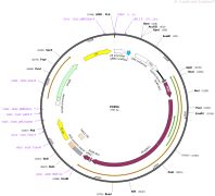 质粒名称:pX330-U6-Chimeric_BB-CBh-hSpCas9-hGem(1/110) 质粒编号:71707 质粒备注: A human codon-optimized SpCas9 fused to first 110 amino acids of human GEMININ and chimeric guide RNA expression plasmid 载体名称:pX330-U6-Chimeric_BB-CBh-hSpCas9 完整质粒大小:8854 载体类型:哺乳动物表达,CRISPR 原核抗性:氨苄青霉素,100μg/mL 培养温度:37℃ 克隆菌株:NEB Stable 高拷贝/低拷贝:高拷贝 插入基因:humanized S. pyogenes Cas9 fused to human Geminin 基因别名:hSpCas9-hGem(1/110) 基因别名:hCas9-hGem(1/110) 基因别名:GEMININ 物种来源:H. sapiens (human) 插入大小:4614 基因名称:GMNN (a.k.a. Gem, MGORS6) 启动子:CBh 标签/融合蛋白:· 3xFLAG (N terminal on insert) · hGEM(1/110) (C terminal on insert) 克隆方法:限制性内切酶 5'克隆位点:AgeI (not destroyed) 3'克隆位点:EcoRI (not destroyed) 5'测序引物:pCBhProF (AGGGATGGTTGGTTGGTGGG) 3'测序引物:CCAATCCTCCCCCTTGCTGT or BGH-rev 质粒图谱: