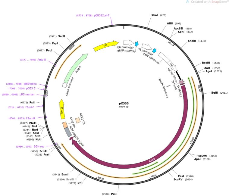 质粒名称:pX333 质粒编号:64073 质粒备注: (Empty Backbone) Vector for tandem expression of two sgRNAs from two independent U6 promoters. Cas9 is expressed by Cbh promoter. 载体名称:pX333 载体大小:9000 载体类型:哺乳动物表达 原核抗性:氨苄青霉素,100μg/mL 培养温度:37℃ 克隆菌株:DH5alpha 高拷贝/低拷贝:未知 启动子:CBh; U6 克隆方法:限制性内切酶 质粒图谱: