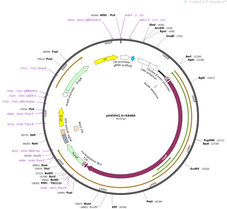 质粒名称:pX459V2.0+K848A 质粒编号:108296 质粒备注: (Empty Backbone) pX459 V2.0 (Plasmid #62988) with the K848A mutation 载体名称:pX459 载体大小:9175 载体类型:哺乳动物表达,CRISPR 筛选标记:嘌呤霉素 原核抗性:氨苄青霉素,100μg/mL 培养温度:37℃ 克隆菌株:DH5alpha 高拷贝/低拷贝:高拷贝 克隆方法:限制性内切酶 5'测序引物:ACTATCATATGCTTACCGTAAC 质粒图谱: