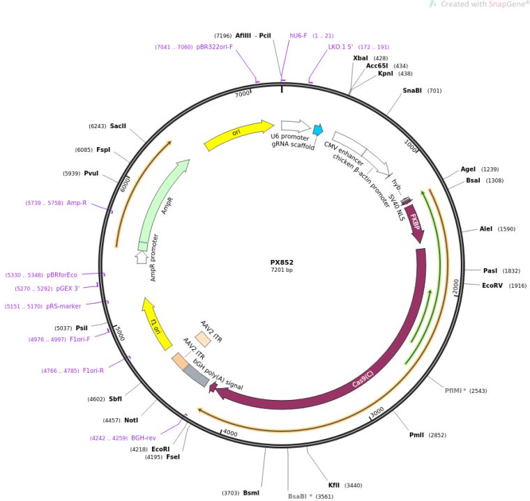 质粒名称:PX852 质粒编号:62884 质粒备注: C-term SpCas9 piece of inducible split-4 (Cas9(C)-FKBP split-4). 载体名称:PX330 载体大小:4222 完整质粒大小:7201 载体类型:哺乳动物表达,CRISPR 原核抗性:氨苄青霉素,100μg/mL 培养温度:37℃ 克隆菌株:Stbl3 高拷贝/低拷贝:未知 插入基因:SpCas9 (aa536-1368) 插入大小:2979 启动子:CBh 标签/融合蛋白:· NLS SV40 (N terminal on insert) · FKBP12 (N terminal on insert) · NLS nucleoplasmin (C terminal on insert) 克隆方法:限制性内切酶 5'克隆位点:Age1 (not destroyed) 3'克隆位点:EcoR1 (not destroyed) 5'测序引物:ctggagcacctgcctgaaatcact? 3'测序引物:GGCTGATCAGCGAGCTCTAG? 质粒图谱: