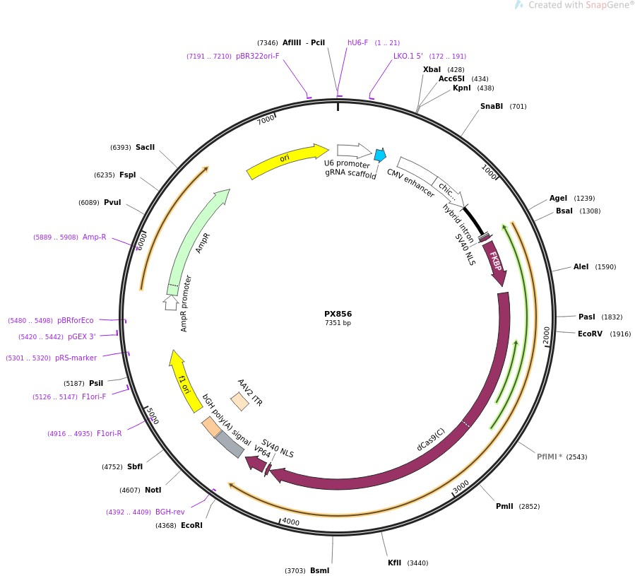 质粒名称:PX856 质粒编号:62888 质粒备注: C-term SpCas9 piece of inducible transcriptional activator (dCas9(C)-FKBP-2xNLS-VP64) 载体名称:PX330 载体大小:4222 完整质粒大小:7351 载体类型:哺乳动物表达,CRISPR 原核抗性:氨苄青霉素,100μg/mL 培养温度:37℃ 克隆菌株:Stbl3 高拷贝/低拷贝:未知 插入基因:SpCas9 (aa536-1368) 基因突变:Asparagine 863 to Alanine (N863A) 插入大小:3129 启动子:CBh 标签/融合蛋白:· NLS SV40 (N terminal on insert) · FKBP12 (N terminal on insert) · NLS (C terminal on insert) · VP64 (C terminal on insert) 克隆方法:限制性内切酶 5'克隆位点:Age1 (not destroyed) 3'克隆位点:EcoR1 (not destroyed) 5'测序引物:ctggagcacctgcctgaaatcact 3'测序引物:GGCTGATCAGCGAGCTCTAG 质粒图谱: