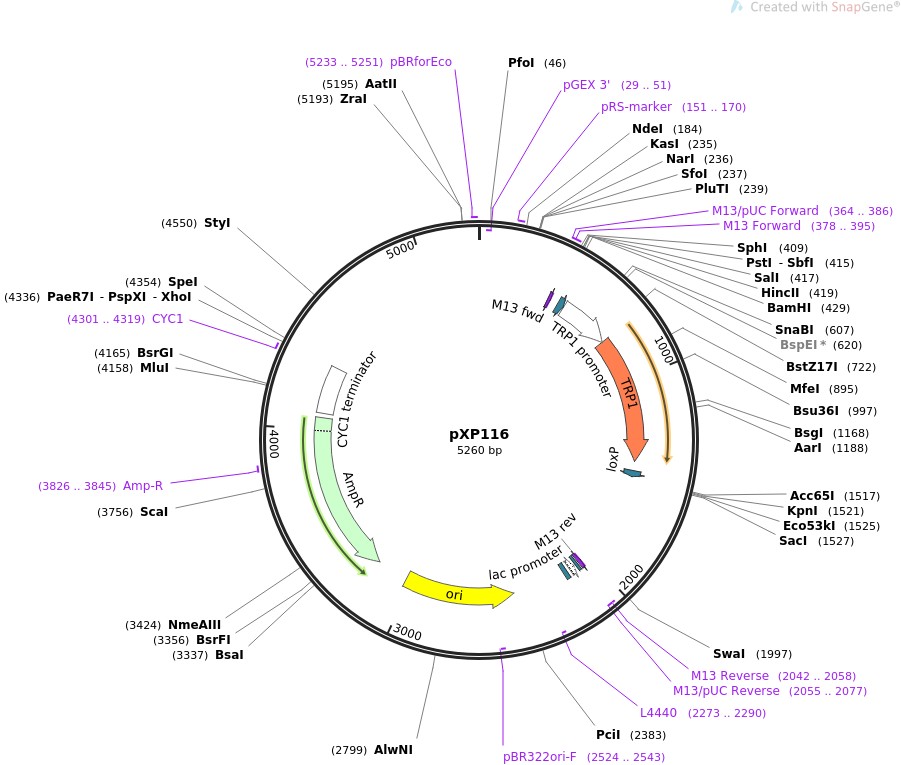 质粒名称:pXP116 质粒编号:26813 质粒备注: (Empty Backbone) 载体名称:pUC18 载体大小:5260 载体类型:Yeast Expression, Cre/Lox 筛选标记:TRP1 原核抗性:氨苄青霉素,100μg/mL 培养温度:37℃ 克隆菌株:DH5alpha 高拷贝/低拷贝:高拷贝 插入基因:None 克隆方法:限制性内切酶 5'克隆位点:SpeI (not destroyed) 3'克隆位点:XhoI (not destroyed) 质粒图谱: