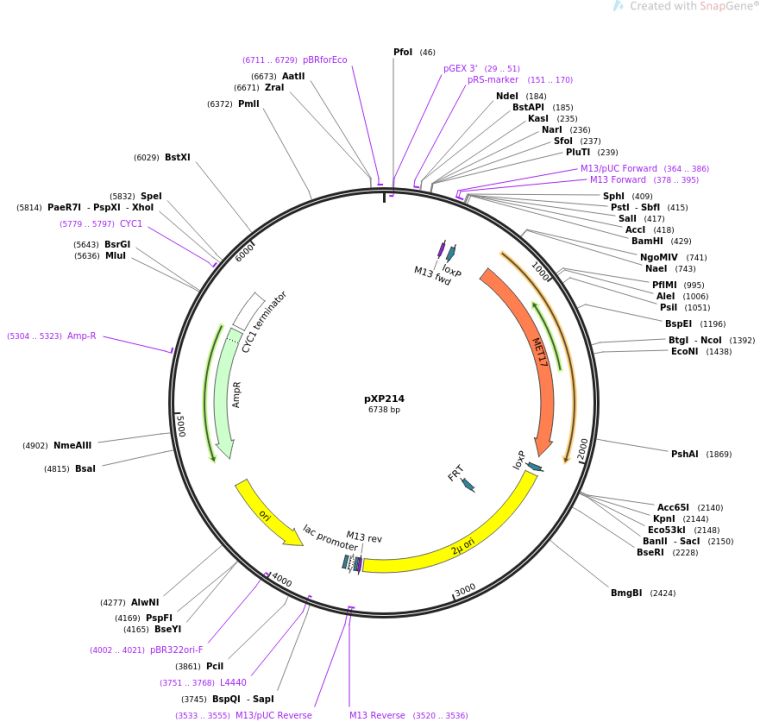 质粒名称:pXP214 质粒编号:26829 质粒备注: (Empty Backbone) 载体名称:pUC18 载体大小:6738 载体类型:Yeast Expression, Cre/Lox 筛选标记:MET15 原核抗性:氨苄青霉素,100μg/mL 培养温度:37℃ 克隆菌株:DH5alpha 高拷贝/低拷贝:高拷贝 插入基因:None 克隆方法:限制性内切酶 5'克隆位点:SpeI (not destroyed) 3'克隆位点:XhoI (not destroyed) 质粒图谱: