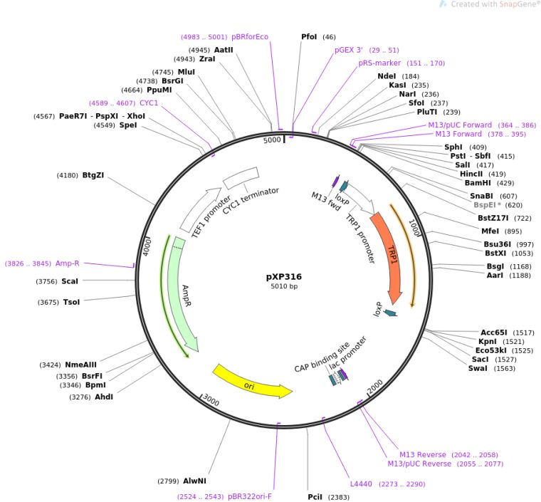 质粒名称:pXP316 质粒编号:26836 质粒备注: (Empty Backbone) 载体名称:pUC18 载体大小:5010 载体类型:酵母表达 筛选标记:TRP1 原核抗性:氨苄青霉素,100μg/mL 培养温度:37℃ 克隆菌株:DH5alpha 高拷贝/低拷贝:高拷贝 插入基因:None 克隆方法:限制性内切酶 5'克隆位点:SpeI (not destroyed) 3'克隆位点:XhoI (not destroyed) 质粒图谱: