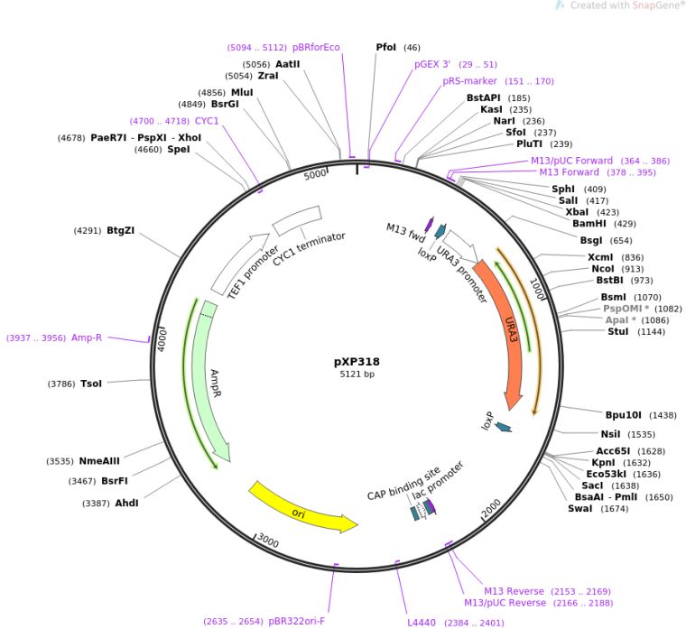 质粒名称:pXP318 质粒编号:26837 质粒备注: (Empty Backbone) 载体名称:pUC18 载体大小:5121 载体类型:酵母表达 筛选标记:URA3 原核抗性:氨苄青霉素,100μg/mL 培养温度:37℃ 克隆菌株:DH5alpha 高拷贝/低拷贝:高拷贝 插入基因:None 克隆方法:限制性内切酶 5'克隆位点:SpeI (not destroyed) 3'克隆位点:XhoI (not destroyed) 质粒图谱: