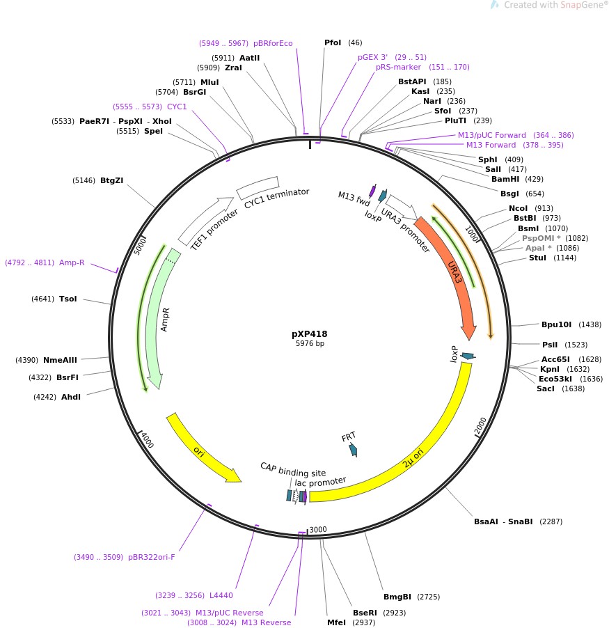 质粒名称:pXP418 质粒编号:26843 质粒备注: (Empty Backbone) 载体名称:pUC18 载体大小:5976 载体类型:Yeast Expression, Cre/Lox 筛选标记:URA3 原核抗性:氨苄青霉素,100μg/mL 培养温度:37℃ 克隆菌株:DH5alpha 高拷贝/低拷贝:高拷贝 插入基因:None 克隆方法:限制性内切酶 5'克隆位点:SpeI (not destroyed) 3'克隆位点:XhoI (not destroyed) 质粒图谱:
