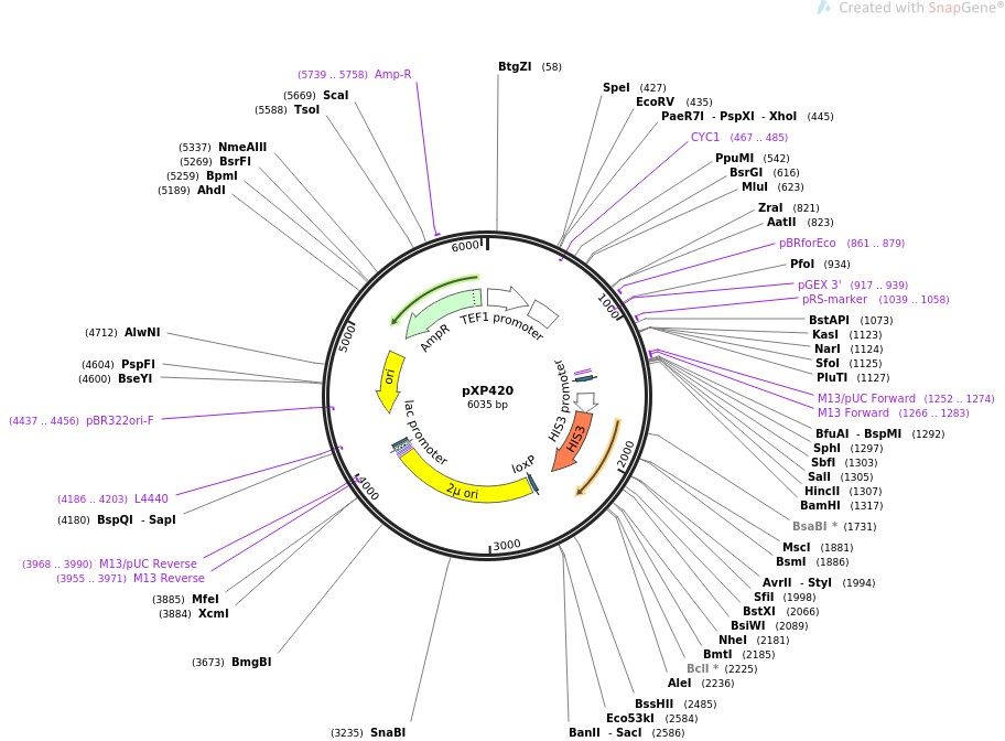 质粒名称:pXP420 质粒编号:26844 质粒备注: (Empty Backbone) 载体名称:pUC18 载体大小:6036 载体类型:Yeast Expression, Cre/Lox 筛选标记:HIS3 原核抗性:氨苄青霉素,100μg/mL 培养温度:37℃ 克隆菌株:DH5alpha 高拷贝/低拷贝:高拷贝 插入基因:None 克隆方法:限制性内切酶 5'克隆位点:SpeI (not destroyed) 3'克隆位点:XhoI (not destroyed) 质粒图谱: