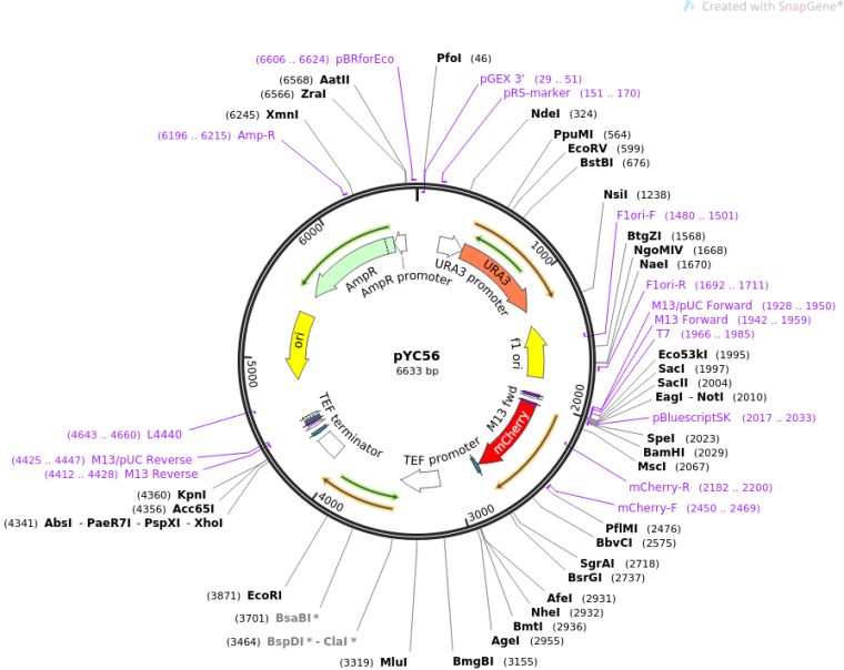 质粒名称:pYC56 质粒编号:63910 质粒备注: (Empty Backbone) Recipient integrative vector to construct mCherry tagged fusions 载体名称:pYC44 载体大小:5915 载体类型:酵母表达 筛选标记:URA3 ; Nourseothricin 原核抗性:氨苄青霉素,100μg/mL 培养温度:30℃ 克隆菌株:DH10B 高拷贝/低拷贝:高拷贝 质粒图谱: