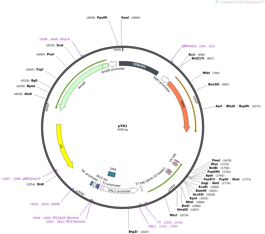 质粒名称:pYD1 质粒编号:73447 质粒备注: (Empty Backbone) expression vector designed for expression, secretion, and display of proteins on the extracellular surface of Saccharomyces cerevisiae cells 载体名称:pYD1 载体类型:酵母表达 筛选标记:TRP1 原核抗性:氨苄青霉素,100μg/mL 培养温度:37℃ 克隆菌株:DH5alpha 高拷贝/低拷贝:未知 启动子:GAL1 标签/融合蛋白:· AGA2 (N terminal on backbone) · T7 peptide (N terminal on backbone) · Xpress tag (N terminal on backbone) · V5 tag (C terminal on backbone) · 6xHis (C terminal on backbone) 克隆方法:限制性内切酶 质粒图谱:
