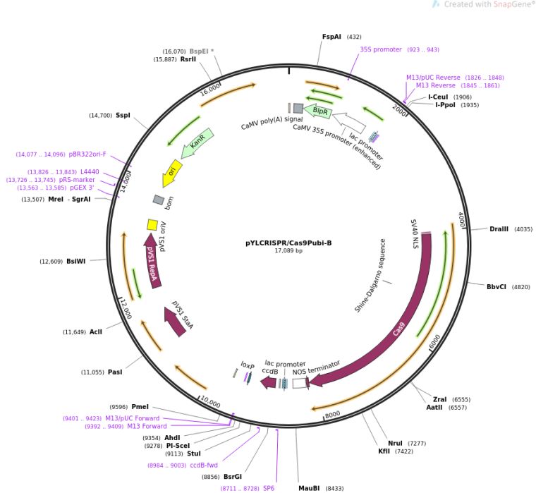 质粒名称:pYLCRISPR/Cas9Pubi-B 质粒编号:66188 质粒备注: expression of Cas9 in plants, maize ubiquitin promoter (Pubi), basta selection 载体名称:pCAMBIA1300 载体类型:Plant Expression 筛选标记:Basta 原核抗性:卡那霉素,50μg/mL 培养温度:37℃ 克隆菌株:Top10F' 高拷贝/低拷贝:未知 插入基因:Cas9 物种来源:S. pyogenes 基因突变:plant-codon optimized with higher GC contents (62.5%) in the 5’ region (400 bp) and 54.2% overall GC content 启动子:maize ubiquitin promoter (Pubi) 克隆方法:未知 5'测序引物:M13pUC-Rev 3'测序引物:NOSterm-R attgccaaatgtttgaacga 质粒图谱: