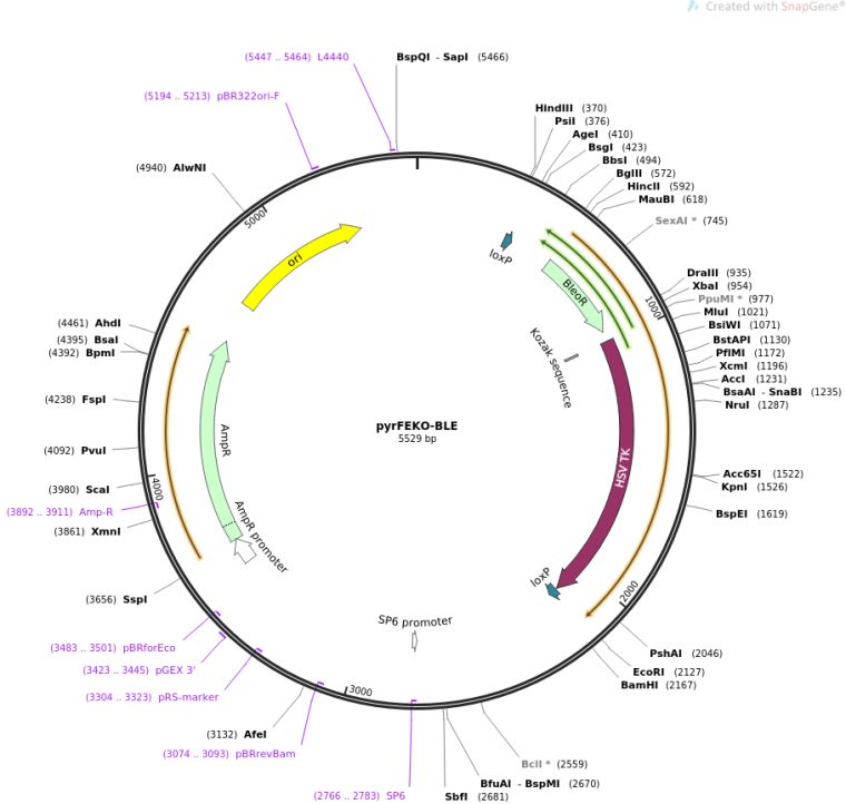 质粒名称:pyrFEKO-BLE 质粒编号:24023 质粒备注: (Empty Backbone) 载体名称:pyrFEKO 载体大小:5529 载体类型:Floxed targeting vector for Trypanosome 筛选标记:Phleomycin 原核抗性:氨苄青霉素,100μg/mL 培养温度:37℃ 克隆菌株:DH5alpha 高拷贝/低拷贝:未知 插入基因:None 克隆方法:限制性内切酶 5'克隆位点:BamHI/PvuII (not destroyed) 3'克隆位点:SbfI/HindIII (not destroyed) 5'测序引物:n/a 3'测序引物:SP6 质粒图谱: