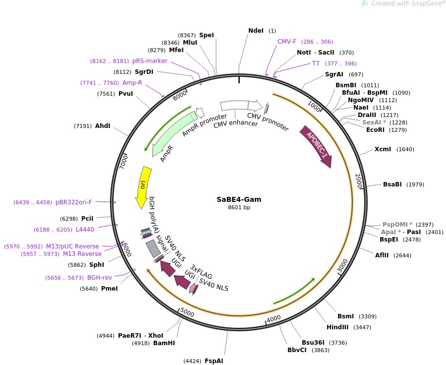 质粒名称:SaBE4-Gam 质粒编号:100809 质粒备注: Expresses SaBE4-Gam in mammalian cells 载体名称:pCMV 载体大小:3402 完整质粒大小:8601 载体类型:哺乳动物表达 原核抗性:氨苄青霉素,100μg/mL 培养温度:37℃ 克隆菌株:DH5alpha 高拷贝/低拷贝:高拷贝 插入基因:SaBE4-Gam 物种来源:R. norvegicus (rat), Synthetic; S. Aureus 插入大小:5199 启动子:CMV 克隆方法:Gibson Cloning 5'测序引物:T7 3'测序引物:M13R 质粒图谱: