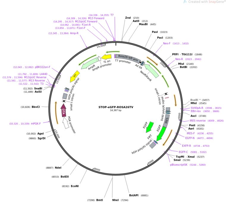 质粒名称:STOP-eGFP-ROSA26TV 质粒编号:11739 载体名称:pBSII KS 载体大小:2900 载体类型:Cre/Lox ; /STOP 筛选标记:Neomycin (select with G418) ; Diptheriatoxin A 原核抗性:氨苄青霉素,100μg/mL 培养温度:37℃ 克隆菌株:DH5alpha 高拷贝/低拷贝:高拷贝 插入基因:STOP-eGFP-ROSA26TV 物种来源:DNA derived from yeast E. Coli, transposon Tn5, Corynebacterium Aequoria (jellyfish) 插入大小:11500 克隆方法:限制性内切酶 5'克隆位点:SnaBI (not destroyed) 3'克隆位点:SacI (not destroyed) 5'测序引物:T7/M13 3'测序引物:T7/M13 质粒图谱: