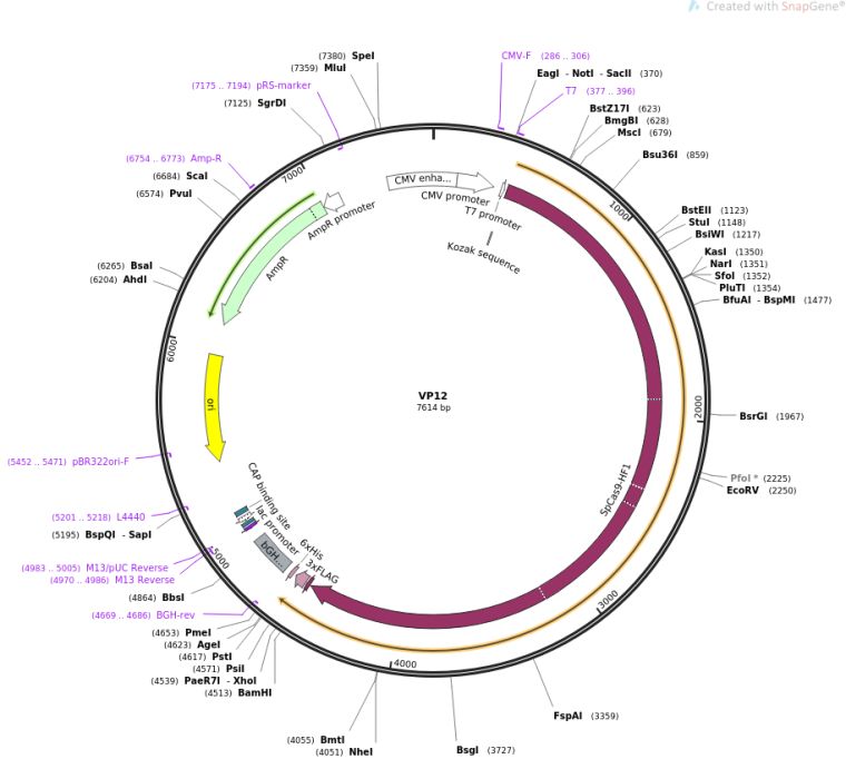 质粒名称:VP12 质粒编号:72247 质粒备注: Human expression plasmid for SpCas9-HF1 variant: CMV-T7-humanSpCas9-HF1(N497A, R661A, Q695A, Q926A)-NLS-3xFLAG 载体名称:JDS246 载体类型:哺乳动物表达,CRISPR 原核抗性:氨苄青霉素,100μg/mL 培养温度:37℃ 克隆菌株:DH5alpha 高拷贝/低拷贝:高拷贝 插入基因:mammalian codon-optimized Streptococcus pyogenes Cas9 HF1(N497A/R661A/Q695A/Q926A)-NLS-3xFlag 物种来源:S. pyogenes 基因突变:N497A, R661A, Q695A and Q926A 启动子:CMV 标签/融合蛋白:· NLS (C terminal on insert) · 3x FLAG (C terminal on insert) 克隆方法:未知 5'测序引物:CMV-F 3'测序引物:BGH-rev 质粒图谱: