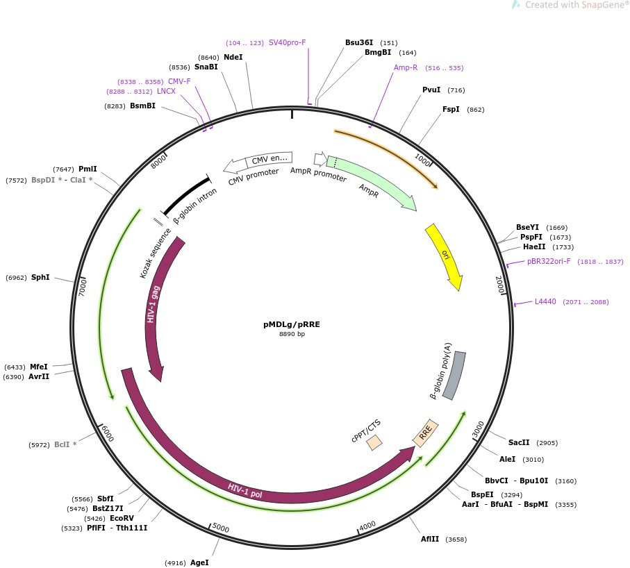 质粒名称:pMDLg/pRRE 质粒编号:12251 质粒备注: 3rd generation lentiviral packaging plasmid; Contains Gag and Pol; also requires pRSV-Rev (Addgene#12253) and envelope expressing plasmid (Addgene#12259) 载体名称:pMD 载体大小:8895 载体类型:Mammalian Expression, Lentiviral ; Packaging 原核抗性:氨苄青霉素,100μg/mL 培养温度:37℃ 克隆菌株:DH5alpha 高拷贝/低拷贝:高拷贝 插入基因:HIV-1 GAG/POL 克隆方法:限制性内切酶 5'测序引物:CMV Fwd 质粒图谱: