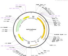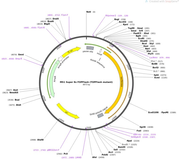 质粒名称:M51 Super 8x FOPFlash (TOPFlash mutant) 质粒编号:12457 质粒备注: Control for beta-catenin reporter. Contains mutated TCF/LEF binding sites upstream of a luciferase reporter. 载体名称:pGL3 载体大小:4839 载体类型:Mammalian Expression, Luciferase 原核抗性:氨苄青霉素,100μg/mL 培养温度:37℃ 克隆菌株:DH5alpha 高拷贝/低拷贝:高拷贝 插入基因:mutant TCF/LEF binding sites 基因别名:beta catenin reporter 基因突变:mutant TCF/LEF binding sites 插入大小:134 基因名称:Ctnnb1 (a.k.a. Bfc, Catnb, Mesc) 克隆方法:限制性内切酶 5'克隆位点:Asp718 (not destroyed) 3'克隆位点:XmaI (not destroyed) 5'测序引物:RVPrimer3 3'测序引物:LucNRev 质粒图谱:
