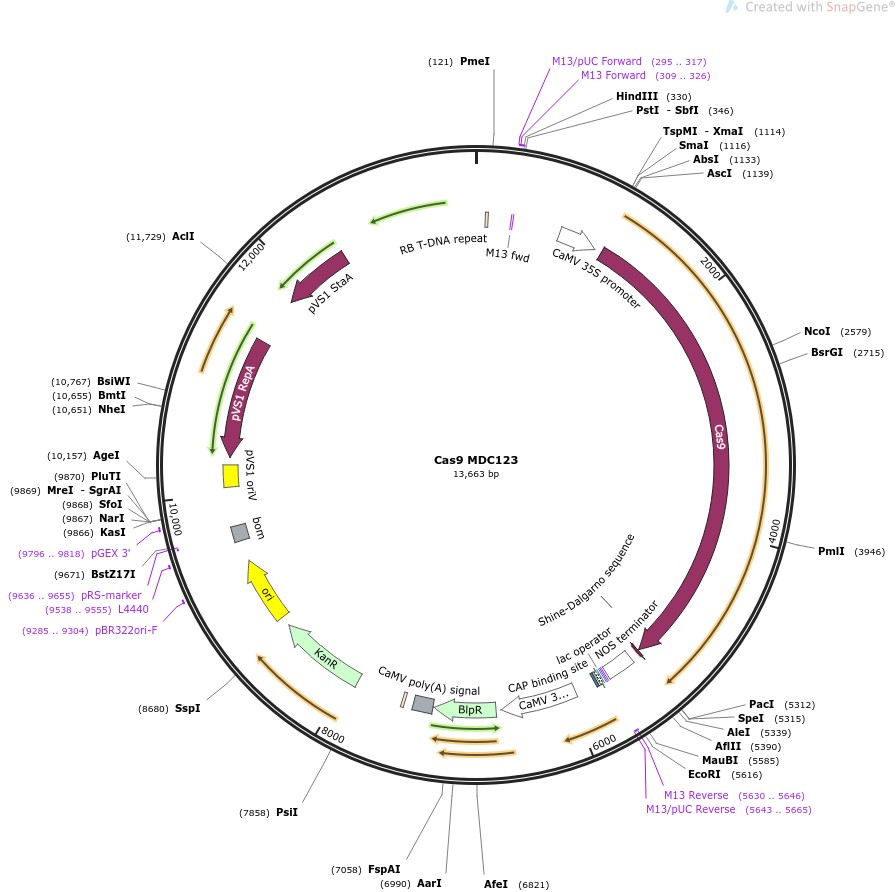 质粒名称:Cas9 MDC123 质粒编号:59184 质粒备注: 2x35S promoting Glycing Max codon optimized Cas9 with bar plant selection 载体名称:pMDC123 载体大小:10213 完整质粒大小:13658 载体类型:Plant Expression, CRISPR 筛选标记:Basta 原核抗性:卡那霉素,50μg/mL 培养温度:37℃ 克隆菌株:DH5alpha 高拷贝/低拷贝:未知 插入基因:Glycine Max codon optimized Cas9 基因别名:Cas9 物种来源:Glycine Max 插入大小:4140 启动子:2X35S 克隆方法:限制性内切酶 5'克隆位点:SalI (not destroyed) 3'克隆位点:PacI (not destroyed) 5'测序引物:M13_forward20_primer 3'测序引物:M13_reverse_primer 质粒图谱: