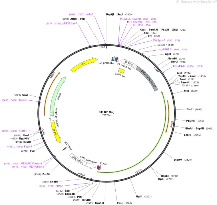 质粒名称:hTLR2 flag 质粒编号:13082 载体名称:pFlag-CMV-1 载体大小:4700 载体类型:哺乳动物表达 原核抗性:氨苄青霉素,100μg/mL 培养温度:37℃ 克隆菌株:DH5alpha 高拷贝/低拷贝:高拷贝 插入基因:TLR2 基因别名:toll-like receptor 2 物种来源:H. sapiens (human) 基因突变:Amino acids 1-16 have been replaced with mammalian signal sequence (SALLILALVGAAVA) followed by Flag tag 插入大小:2300 基因名称:TLR2 (a.k.a. CD282, TIL4) 克隆方法:限制性内切酶 5'克隆位点:HindIII (not destroyed) 3'克隆位点:BamHI (not destroyed) 5'测序引物:CMV30 3'测序引物:CMV24 质粒图谱: