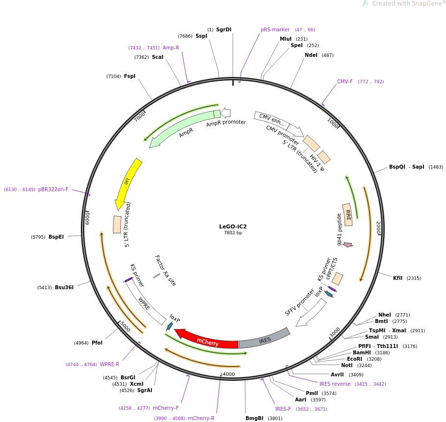 质粒名称:LeGO-iC2 质粒编号:27345 载体名称:LeGO 载体大小:7820 载体类型:哺乳动物表达,慢病毒 原核抗性:氨苄青霉素,100μg/mL 培养温度:37℃ 克隆菌株:Stbl3 高拷贝/低拷贝:高拷贝 插入基因:SFFV promoter, IRES-mCherry 克隆方法:限制性内切酶 5'测序引物:GAGCTCACAACCCCTCACTC 质粒图谱: