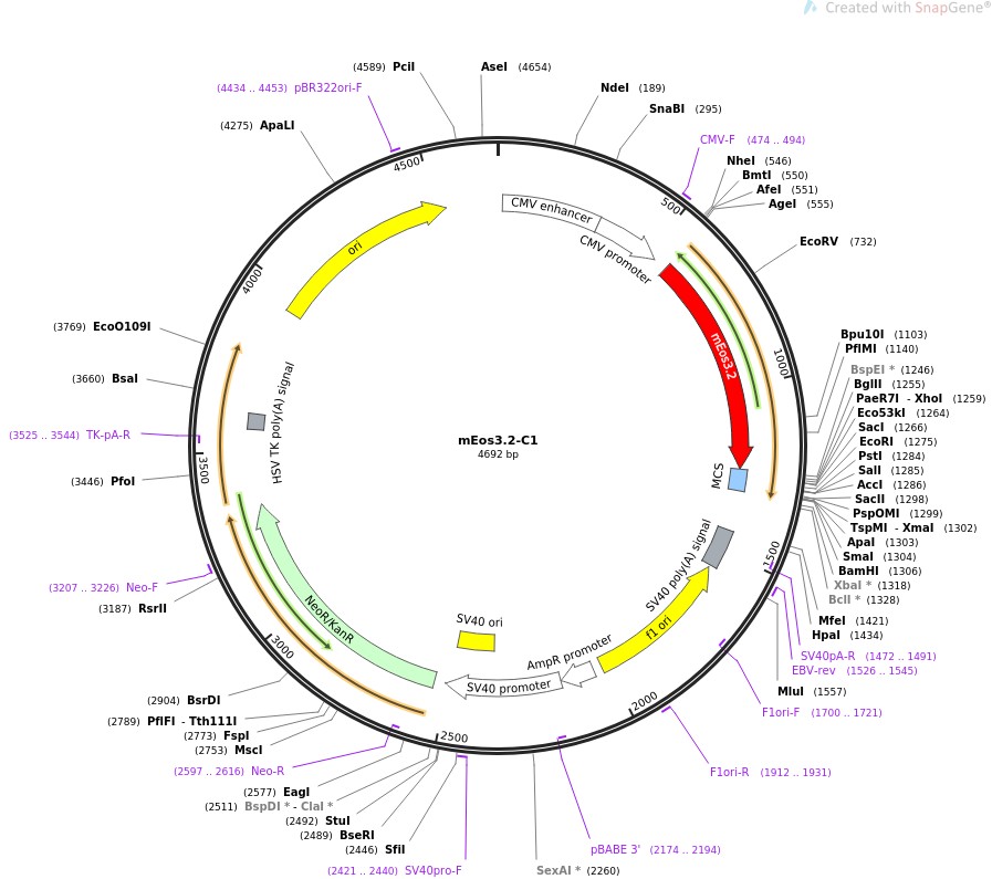 质粒名称:mEos3.2-C1 质粒编号:54550 质粒备注: (Empty Backbone) Localization: C1 Cloning Vector, Excitation: 507 / 572, Emission: 516 / 580 载体名称:mEos3.2-C1 载体大小:4750 载体类型:哺乳动物表达 筛选标记:新霉素(G418) 原核抗性:卡那霉素,50μg/mL 培养温度:37℃ 克隆菌株:DH5alpha 高拷贝/低拷贝:高拷贝 插入基因:None 质粒图谱: