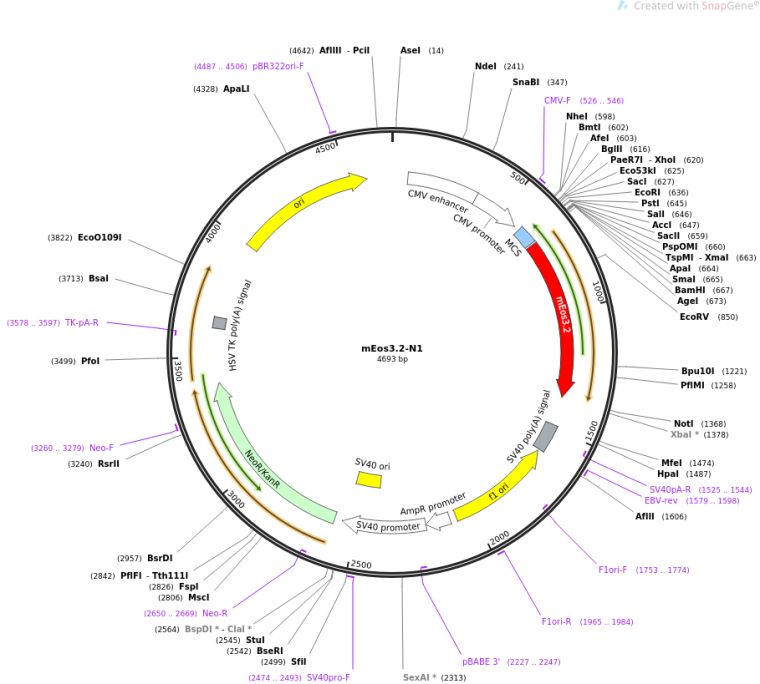 质粒名称:mEos3.2-N1 质粒编号:54525 质粒备注: (Empty Backbone) Localization: N1 Cloning Vector, Excitation: 507 / 572, Emission: 516 / 580 载体名称:mEos3.2-N1 载体大小:4750 载体类型:哺乳动物表达 筛选标记:新霉素(G418) 原核抗性:卡那霉素,50μg/mL 培养温度:37℃ 克隆菌株:DH5alpha 高拷贝/低拷贝:高拷贝 插入基因:None 启动子:CMV 克隆方法:未知 5'测序引物:CMV-F 3'测序引物:SV40pA-R 质粒图谱: