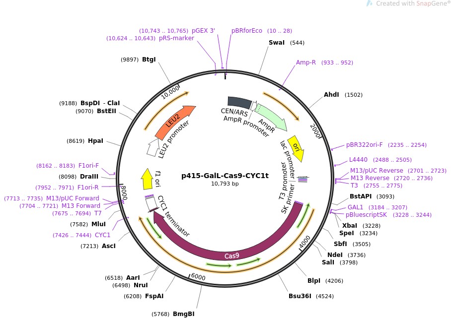 质粒名称:p415-GalL-Cas9-CYC1t 质粒编号:43804 载体名称:p415 载体大小:6670 完整质粒大小:10810 载体类型:Yeast Expression, CRISPR 筛选标记:LEU2 原核抗性:氨苄青霉素,100μg/mL 培养温度:37℃ 克隆菌株:DH5alpha 高拷贝/低拷贝:高拷贝 插入基因:Human Optimized S. pyogenes Cas9 物种来源:H. sapiens (human), S. cerevisiae (budding yeast); S.pyogenes 插入大小:4140 启动子:GalL 克隆方法:未知 5'测序引物:T3 promoter 3'测序引物:T7 promoter 质粒图谱: