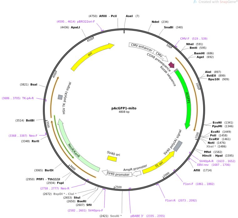 质粒名称:pAcGFP1-mito 质粒编号:174180 质粒备注: Express AcGFP1 with mitochondria-targeting sequence in mammalian cells 载体名称:pUC 载体大小:3800 完整质粒大小:4700 载体类型:哺乳动物表达 筛选标记:新霉素(G418) 原核抗性:卡那霉素,50μg/mL 培养温度:37℃ 克隆菌株:DH5alpha 高拷贝/低拷贝:高拷贝 插入基因:AcGFP with mitochondria-targeting sequence 插入大小:800 启动子:CMV 克隆方法:限制性内切酶 5'克隆位点:AgeI (not destroyed) 3'克隆位点:NotI (not destroyed) 5'测序引物:none 3'测序引物:none 质粒图谱:
