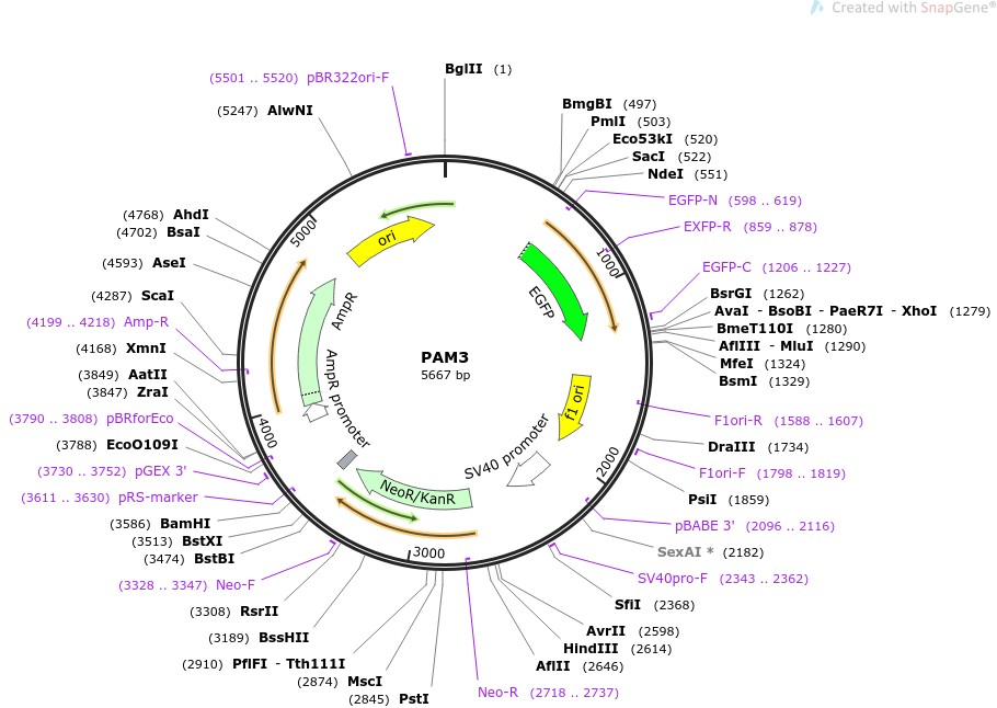 质粒名称:PAM3 质粒编号:198742 质粒备注: pTPBF-GFP, Geneticin resistance 载体名称:PAM3 载体大小:5667 完整质粒大小:5667 载体类型:Acanthamoeba expression 筛选标记:新霉素(G418) 原核抗性:Ampicillin, 100 渭g/mL 培养温度:37掳C 克隆菌株:DH5alpha 高拷贝/低拷贝:未知 插入基因:GFP 插入大小:720 启动子:pTPBF 克隆方法:限制性内切酶 5'克隆位点:BglII (not destroyed) 3'克隆位点:NdeI (not destroyed) 5'测序引物:AGATCTCTTGGATCGGGCGCTGAAC 3'测序引物:CATATGATTTCTAGAGGCACAAGAC 质粒图谱: