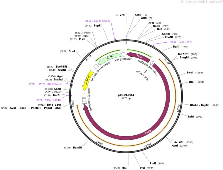 质粒名称:pCas9-CR4 质粒编号:62655 质粒备注: Cas9 nuclease under control of pTet promoter with ssrA tag and constitutive tetR 载体名称:pdCas9-bacteria 完整质粒大小:6770 载体类型:原核表达 原核抗性:氯霉素25μg/mL 培养温度:37℃ 克隆菌株:DH5alpha 高拷贝/低拷贝:低拷贝 插入基因:Cas9 nuclease 质粒图谱:
