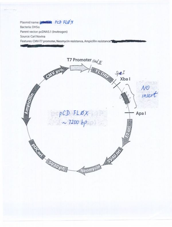 质粒名称:PCD FL0X 质粒编号:12563 质粒备注: (Empty Backbone) 载体名称:pcDNA3.1 载体大小:7200 载体类型:Mammalian Expression, Luciferase ; Reporter for translation repression 筛选标记:新霉素(G418) 原核抗性:氨苄青霉素,100μg/mL 培养温度:37℃ 克隆菌株:DH5alpha 高拷贝/低拷贝:高拷贝 插入基因:None 克隆方法:限制性内切酶 5'克隆位点:XbaI (not destroyed) 3'克隆位点:ApaI (not destroyed) 5'测序引物:n/a 3'测序引物:BGH rev primer 质粒图谱: