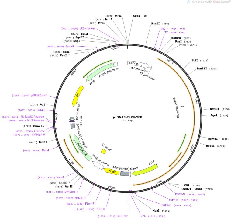 质粒名称:pcDNA3-TLR9-YFP 质粒编号:13642 载体名称:pcDNA3-YFP 载体大小:6100 载体类型:哺乳动物表达 筛选标记:新霉素(G418) 原核抗性:氨苄青霉素,100μg/mL 培养温度:37℃ 克隆菌株:DH5alpha 高拷贝/低拷贝:高拷贝 插入基因:Toll-Like Receptor 9 基因别名:TLR9 物种来源:H. sapiens (human) 插入大小:3100 基因名称:TLR9 (a.k.a. CD289) 克隆方法:限制性内切酶 5'克隆位点:BamHI (not destroyed) 3'克隆位点:XhoI (not destroyed) 5'测序引物:T7 3'测序引物:GTCTTGTAGTTGCCGTCGTC 质粒图谱: