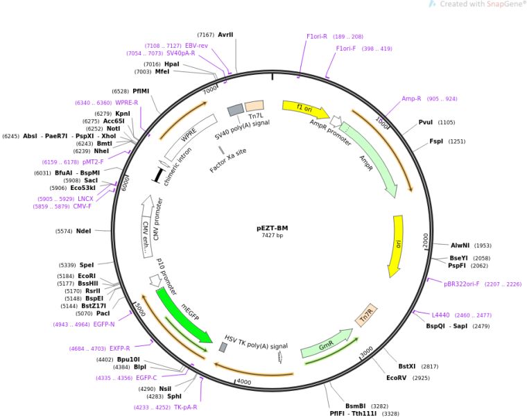 质粒名称:pEZT-BM 质粒编号:74099 质粒备注: (Empty Backbone) Multi-purpose rapid titer bacmam expression vector 载体名称:Modified pFastBacDual 载体类型:Mammalian Expression ; Bacmam, Baculovirus 原核抗性:Ampicillin, 100 渭g/mL 培养温度:37掳C 克隆菌株:DH5alpha 高拷贝/低拷贝:高拷贝 启动子:CMV, p10 克隆方法:Ligation Independent Cloning 质粒图谱: