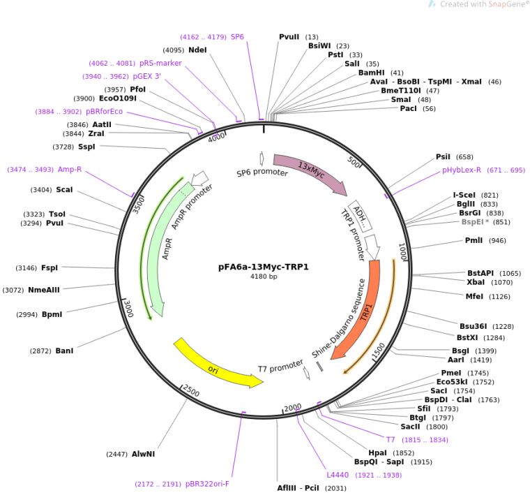 质粒名称:pFA6a-13Myc-TRP1 质粒编号:41601 载体名称:pFA6a 载体大小:2300 载体类型:Yeast genomic targeting 筛选标记:TRP1 原核抗性:氨苄青霉素,100μg/mL 培养温度:37℃ 克隆菌株:DH5alpha 高拷贝/低拷贝:未知 插入基因:TRP1 物种来源:S. cerevisiae (budding yeast) 插入大小:1802 基因名称:TRP1 (a.k.a. YDR007W) 标签/融合蛋白:· 13Myc (N terminal on insert) · yeast ADH1 terminator (N terminal on insert) 克隆方法:限制性内切酶 5'克隆位点:PacI (not destroyed) 3'克隆位点:PmeI (not destroyed) 5'测序引物:Sp6_primer 3'测序引物:T7_promoter 质粒图谱: