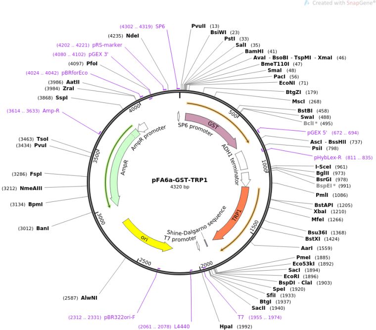 质粒名称:pFA6a-GST-TRP1 质粒编号:41603 载体名称:pFA6a 载体大小:2300 载体类型:Yeast genomic targeting 筛选标记:TRP1 原核抗性:氨苄青霉素,100μg/mL 培养温度:37℃ 克隆菌株:DH5alpha 高拷贝/低拷贝:未知 插入基因:TRP1 物种来源:S. cerevisiae (budding yeast) 插入大小:1942 基因名称:TRP1 (a.k.a. YDR007W) 标签/融合蛋白:· GST (N terminal on insert) · yeast ADH1 terminator (N terminal on insert) 克隆方法:限制性内切酶 5'克隆位点:PacI (not destroyed) 3'克隆位点:PmeI (not destroyed) 5'测序引物:Sp6_primer 3'测序引物:T7_promoter 质粒图谱: