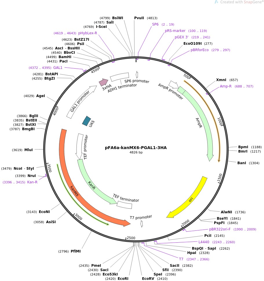 质粒名称:pFA6a-kanMX6-PGAL1-3HA 质粒编号:41608 载体名称:pFA6a 载体类型:Yeast genomic targeting 筛选标记:Gentamicin 原核抗性:氨苄青霉素,100μg/mL 培养温度:37℃ 克隆菌株:DH5alpha 高拷贝/低拷贝:未知 插入基因:GAL1 promoter 基因别名:GAL1 物种来源:S. cerevisiae (budding yeast) 插入大小:2081 基因名称:GAL1 (a.k.a. YBR020W) 标签/融合蛋白:· A. gossypii translation elongation factor 1a gene terminator (N terminal on insert) · KanR reverse orientation (N terminal on insert) · A. gossypii translation elongation factor 1a gene promoter (N terminal on insert) · 3xHA (C terminal on insert) · yeast ADH1 terminator (C terminal on insert) 克隆方法:限制性内切酶 5'克隆位点:BglII (not destroyed) 3'克隆位点:PacI (not destroyed) 5'测序引物:T7_promoter 3'测序引物:Sp6_primer 质粒图谱: