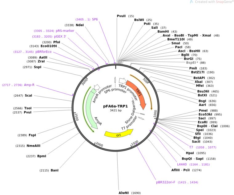 质粒名称:pFA6a-TRP1 质粒编号:41595 载体名称:pFA6a 载体大小:2300 载体类型:Yeast genomic targeting 筛选标记:TRP1 原核抗性:氨苄青霉素,100μg/mL 培养温度:37℃ 克隆菌株:DH5alpha 高拷贝/低拷贝:未知 插入基因:TRP1 物种来源:S. cerevisiae (budding yeast) 插入大小:1036 基因名称:TRP1 (a.k.a. YDR007W) 克隆方法:限制性内切酶 5'克隆位点:BglII (not destroyed) 3'克隆位点:PmeI (not destroyed) 5'测序引物:Sp6_primer 3'测序引物:T7_promoter 质粒图谱: