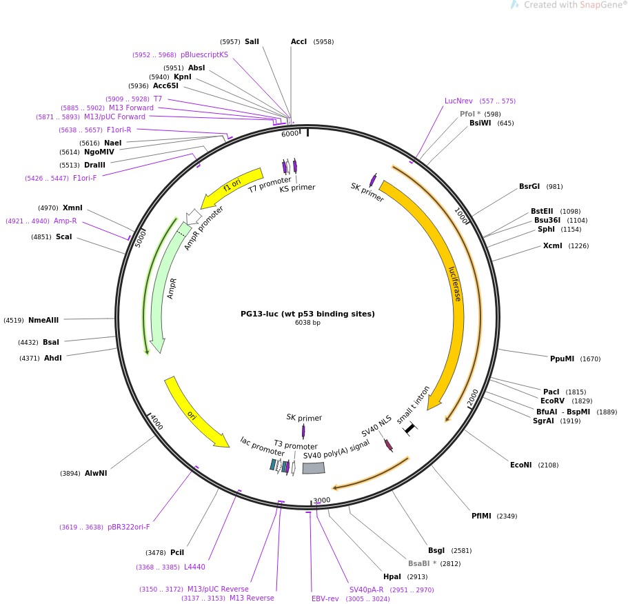 质粒名称:PG13-luc (wt p53 binding sites) 质粒编号:16442 质粒备注: Luciferase reporter containing 13 copies of the p53-binding consensus sequence 载体名称:pBluescript II SK + luc 载体大小:5800 载体类型:Mammalian Expression, Luciferase 原核抗性:氨苄青霉素,100μg/mL 培养温度:37℃ 克隆菌株:DH5alpha 高拷贝/低拷贝:未知 插入基因:p53-binding site 基因名称:TP53 (a.k.a. BCC7, BMFS5, LFS1, P53, TRP53) 克隆方法:限制性内切酶 5'克隆位点:HindIII (unknown if destroyed) 3'克隆位点:EcoRI (unknown if destroyed) 5'测序引物:T7 3'测序引物:LucNrev 质粒图谱: