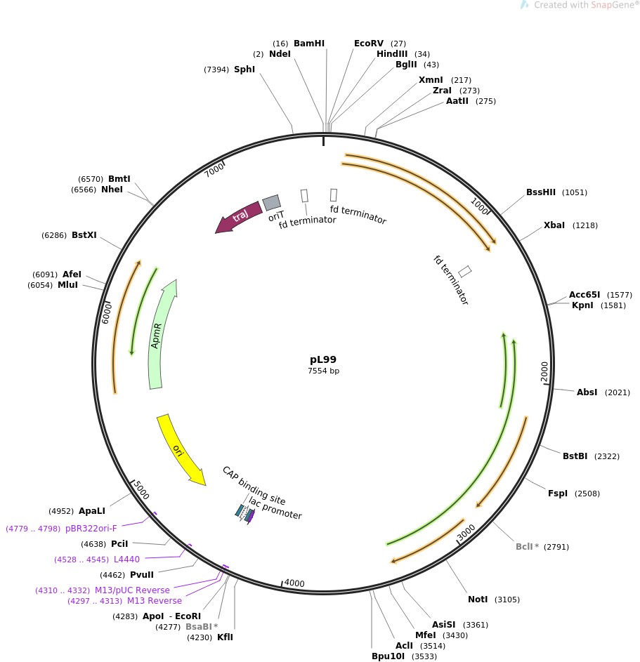 质粒名称:pL99 质粒编号:78577 质粒备注: (Empty Backbone) Over-expression shuttle vector for gene cloning and transfer from E. coli to Streptomyces. Contains inducible PnitA-NitR system 载体名称:pIJ8668 载体类型:Bacterial Expression ; Streptomyces expression 原核抗性:Apramycin, 25 μg/mL 培养温度:37℃ 克隆菌株:DH5alpha 高拷贝/低拷贝:高拷贝 启动子:inducible PnitA-NitR system 克隆方法:限制性内切酶 5'测序引物:5'-gcatgctaaaccgatacaatt-3' 质粒图谱: