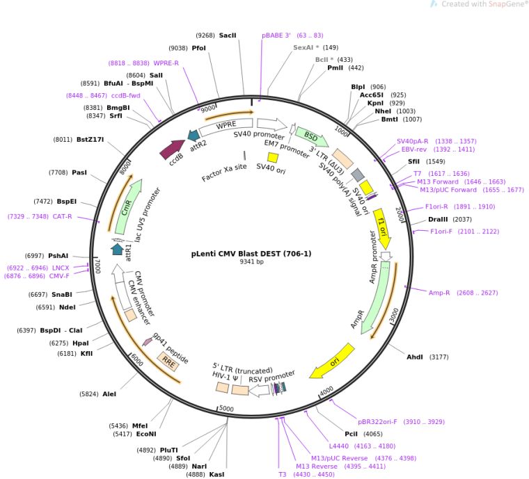 质粒名称:pLenti CMV Blast DEST (706-1) 质粒编号:17451 质粒备注: (Empty Backbone) 3rd gen lentiviral Gateway destination vector, expression, CMV promoter, Blast聽 载体名称:p156RRL-sinPPT-CMV-GFP-PRE/Nhe I 载体大小:9331 载体类型:Mammalian Expression, Lentiviral ; Destination vector 筛选标记:Blasticidin 原核抗性:Chloramphenicol and Ampicillin, 25 & 100 渭g/mL 培养温度:37掳C 克隆菌株:DB3.1 高拷贝/低拷贝:高拷贝 插入基因:None 克隆方法:限制性内切酶 5'测序引物:CMVforw 质粒图谱: