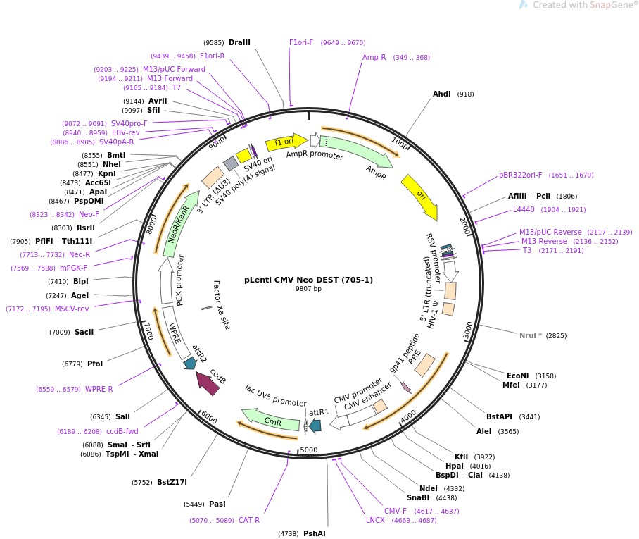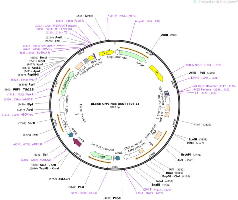 质粒名称:pLenti CMV Neo DEST (705-1) 质粒编号:17392 质粒备注: (Empty Backbone) 3rd gen lentiviral Gateway destination vector, expression, CMV promoter, Neo 载体名称:p156RRL-sinPPT-CMV-GFP-PRE/Nhe I 载体大小:9796 载体类型:Mammalian Expression, Lentiviral ; Destination vector 筛选标记:新霉素(G418) 原核抗性:Chloramphenicol and Ampicillin, 25 & 100 渭g/mL 培养温度:37掳C 克隆菌株:ccdB Survival 高拷贝/低拷贝:高拷贝 插入基因:None 克隆方法:限制性内切酶 5'测序引物:CMVforw 质粒图谱: