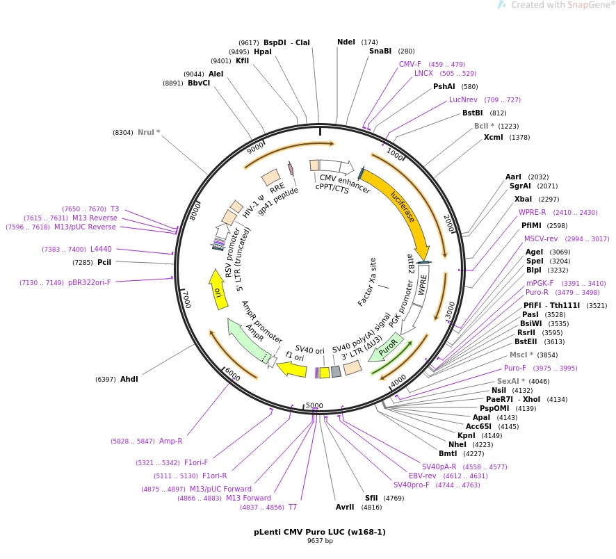 质粒名称:pLenti CMV Puro LUC (w168-1) 质粒编号:17477 质粒备注: 3rd gen lentiviral Luciferase expression vector, CMV promoter, Puro 载体名称:p156RRL-sinPPT-CMV-GFP-PRE/Nhe I 载体大小:7974 载体类型:哺乳动物表达,慢病毒 筛选标记:嘌呤霉素 原核抗性:氨苄青霉素,100μg/mL 培养温度:37℃ 克隆菌株:Stbl3 高拷贝/低拷贝:高拷贝 插入基因:Firefly Luciferase 基因别名:LUC 插入大小:1652 克隆方法:限制性内切酶 5'测序引物:CMVforw 质粒图谱: