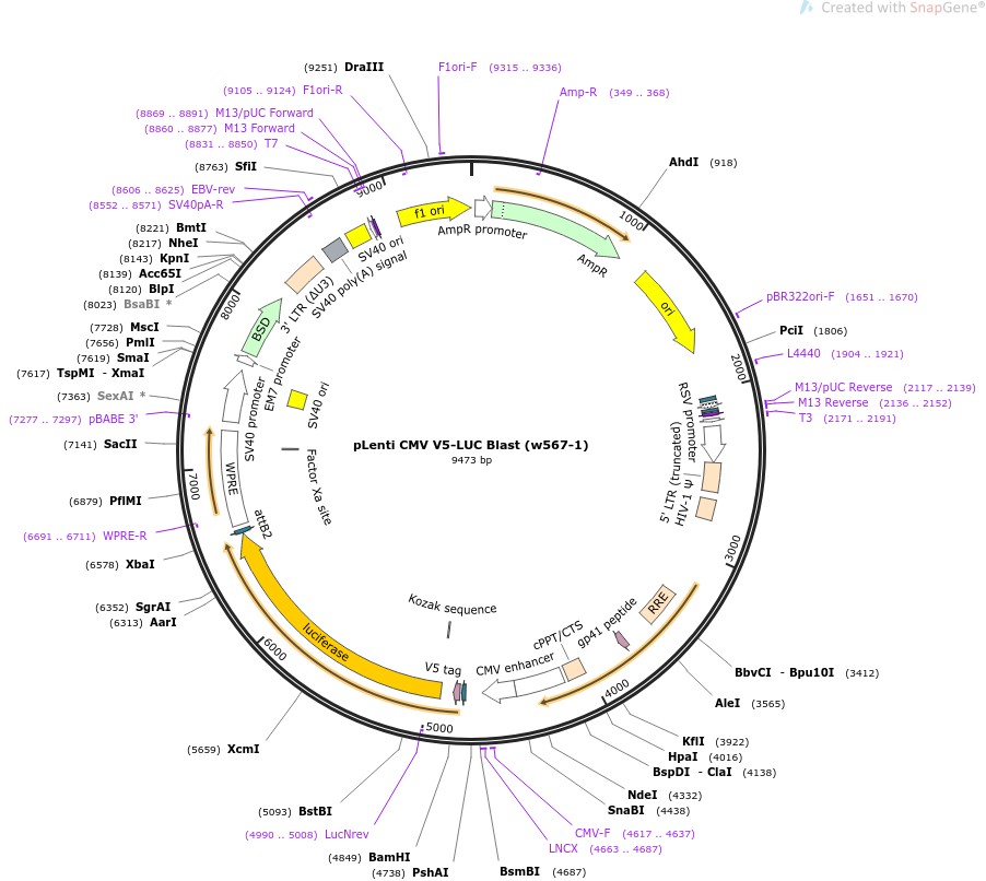 质粒名称:pLenti CMV V5-LUC Blast (w567-1) 质粒编号:21474 质粒备注: 3rd gen lentiviral V5-Luciferase expression vector, CMV promoter, Blast 载体名称:p156RRL-sinPPT-CMV-GFP-PRE/Nhe I 载体大小:7687 载体类型:Mammalian Expression, Lentiviral, Luciferase 筛选标记:Blasticidin 原核抗性:氨苄青霉素,100μg/mL 培养温度:37℃ 克隆菌株:Stbl3 高拷贝/低拷贝:高拷贝 插入基因:V5-LUC 基因别名:Firefly Luciferase 物种来源:Firefly 插入大小:1776 克隆方法:限制性内切酶 5'克隆位点:Bam HI (not destroyed) 3'克隆位点:Xba I (not destroyed) 5'测序引物:CMVforw 3'测序引物:n/a 质粒图谱: