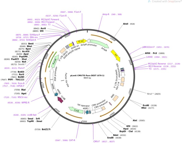 质粒名称:pLenti CMV/TO Puro DEST (670-1) 质粒编号:17293 质粒备注: (Empty Backbone) 3rd gen lentiviral Gateway destination vector, expression, CMV/TO promoter, Puro 载体名称:p156RRL-sinPPT-CMV-GFP-PRE/Nhe I 载体大小:9594 载体类型:Mammalian Expression, Lentiviral ; Destination vector 筛选标记:嘌呤霉素 原核抗性:Chloramphenicol and Ampicillin, 25 & 100 渭g/mL 培养温度:37掳C 克隆菌株:DB3.1 高拷贝/低拷贝:高拷贝 插入基因:None 克隆方法:限制性内切酶 5'测序引物:CMVforw 质粒图谱: