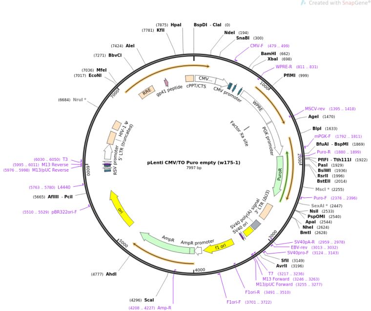 质粒名称:pLenti CMV/TO Puro empty (w175-1) 质粒编号:17482 质粒备注: (Empty Backbone) 3rd gen lentiviral empty control vector, CMV/TO promoter, Puro 载体名称:p156RRL-sinPPT-CMV-GFP-PRE/Nhe I 载体大小:8007 载体类型:哺乳动物表达,慢病毒 筛选标记:嘌呤霉素 原核抗性:氨苄青霉素,100μg/mL 培养温度:37℃ 克隆菌株:Stbl3 高拷贝/低拷贝:高拷贝 插入基因:None 克隆方法:限制性内切酶 5'克隆位点:Bam HI (not destroyed) 3'克隆位点:Xba I (not destroyed) 5'测序引物:CMVforw 质粒图谱: