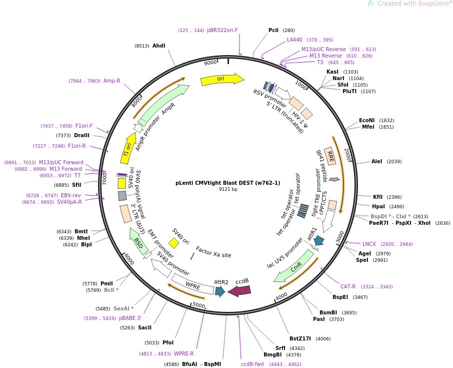 质粒名称:pLenti CMVtight Blast DEST (w762-1) 质粒编号:26434 质粒备注: (Empty Backbone) 载体名称:p156RRL-sinPPT-CMV-GFP-PRE/Nhe I 载体大小:9116 载体类型:Mammalian Expression, Lentiviral ; Tet-On Advanced Destination vector 筛选标记:Blasticidin 原核抗性:Chloramphenicol and Ampicillin, 25 & 100 μg/mL 培养温度:37℃ 克隆菌株:ccdB Survival 高拷贝/低拷贝:高拷贝 插入基因:no insert 克隆方法:限制性内切酶 5'测序引物:CMVtightFORW 3'测序引物:WPRErev 质粒图谱: