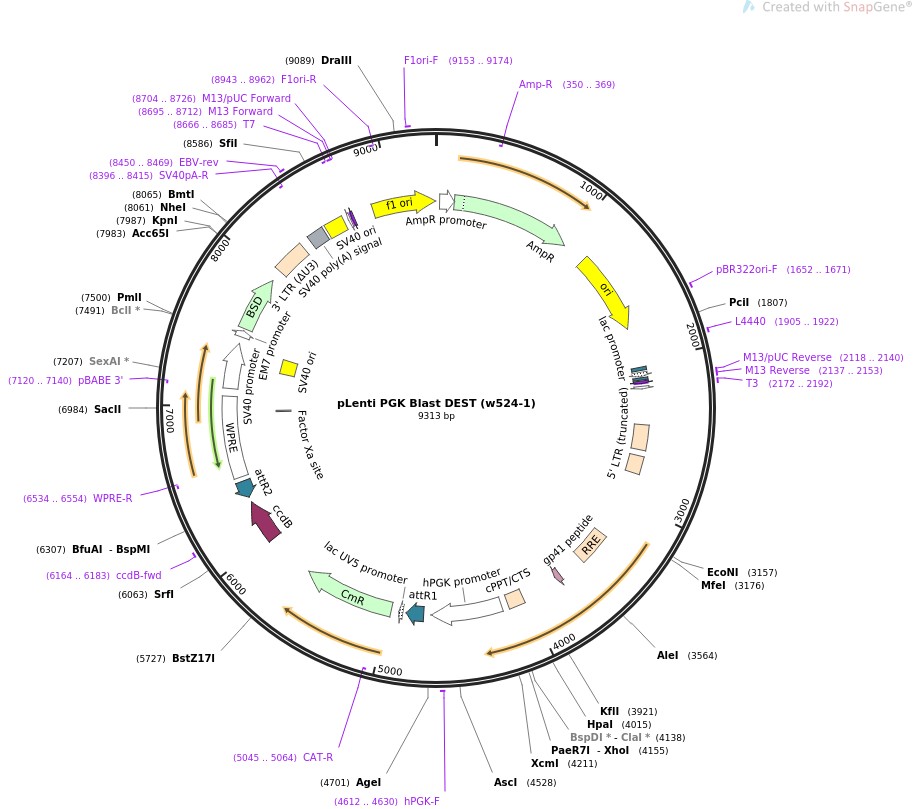 质粒名称:pLenti PGK Blast DEST (w524-1) 质粒编号:19065 质粒备注: (Empty Backbone) 3rd gen lentiviral Gateway destination vector, expression, PGK promoter, Blast 载体名称:p156RRL-sinPPT-CMV-GFP-PRE/Nhe I 载体大小:9313 载体类型:哺乳动物表达,慢病毒 筛选标记:Blasticidin 原核抗性:Chloramphenicol and Ampicillin, 25 & 100 μg/mL 培养温度:37℃ 克隆菌株:ccdB Survival 高拷贝/低拷贝:高拷贝 插入基因:None 克隆方法:Gateway Cloning 5'测序引物:hPGK-F (5'-GTGTTCCGCATTCTGCAAG-3') 质粒图谱: