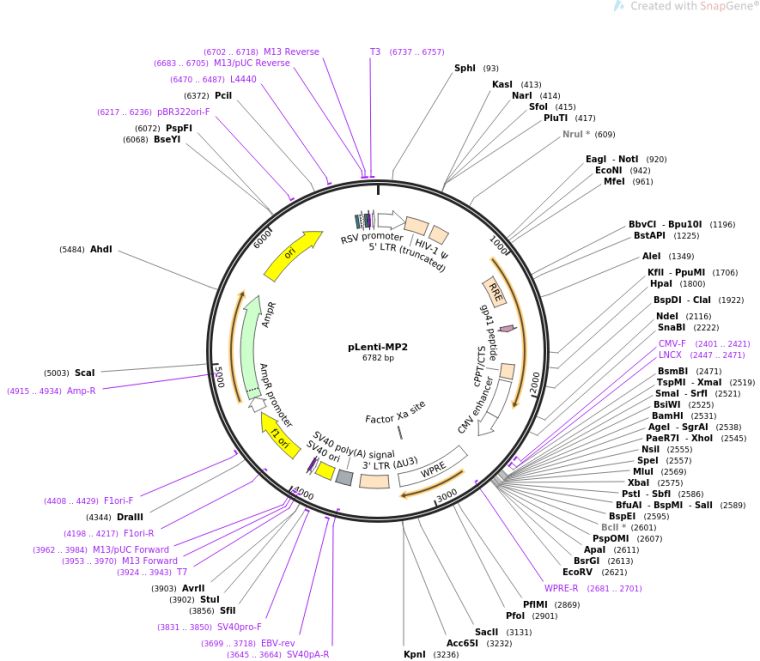 质粒名称:pLenti-MP2 质粒编号:36097 质粒备注: (Empty Backbone) 3rd generation lentiviral plasmid 载体名称:pRRLsinPPT-CMV-MCS-WPRE 载体大小:6782 载体类型:慢病毒 原核抗性:氨苄青霉素,100μg/mL 培养温度:37℃ 克隆菌株:Stbl3 高拷贝/低拷贝:未知 质粒图谱: