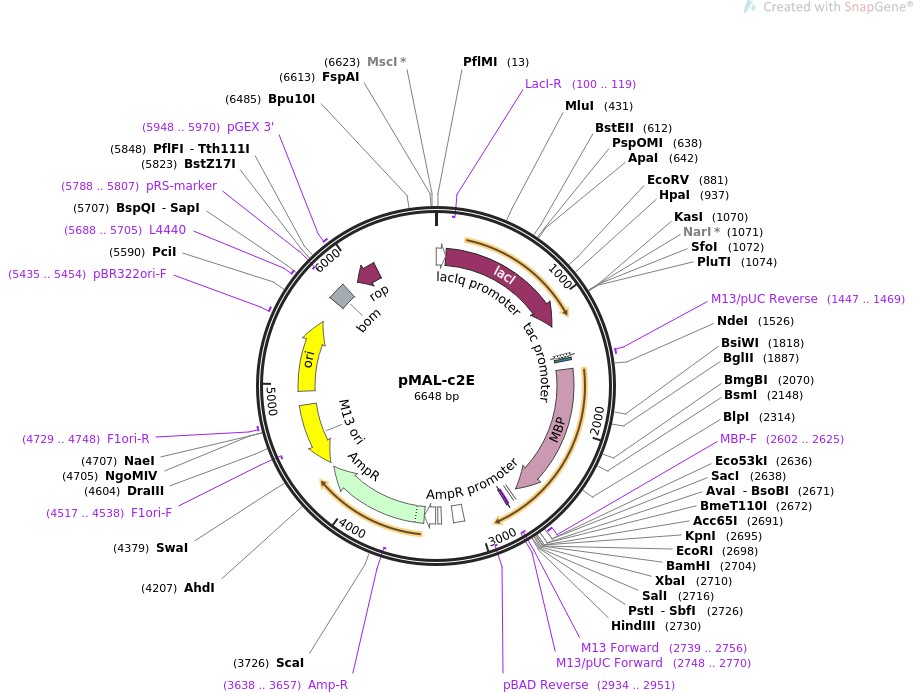 质粒名称:pMAL-c2E 质粒编号:75291 质粒备注: (Empty Backbone) Expresses proteins in the cytoplasm as fusions to maltose-binding protein 载体名称:pMAL-c2E 载体大小:6648 载体类型:原核表达 原核抗性:氨苄青霉素,100μg/mL 培养温度:37℃ 克隆菌株:DH5alpha 高拷贝/低拷贝:低拷贝 启动子:tac 克隆方法:限制性内切酶 5'测序引物:GGTCGTCAGACTGTCGATGAAGCC 3'测序引物:CGCCAGGGTTTTCCCAGTCACGAC 质粒图谱: